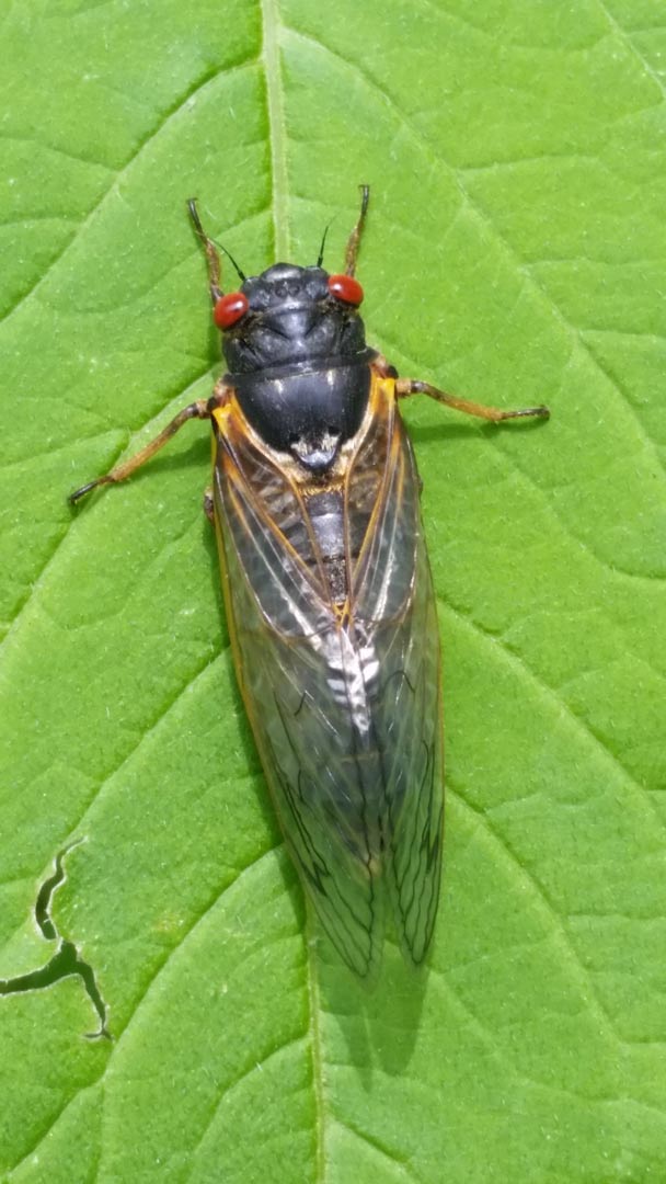 Adults and nymphs feed on xylem fluid – the watery part of plant sap – in the twigs and roots of woody plants. They don’t chew but feed by sucking through their proboscis. Cicadas don’t bite or sting. They have five eyes – two large, red compound eyes and 3 simple eyes.