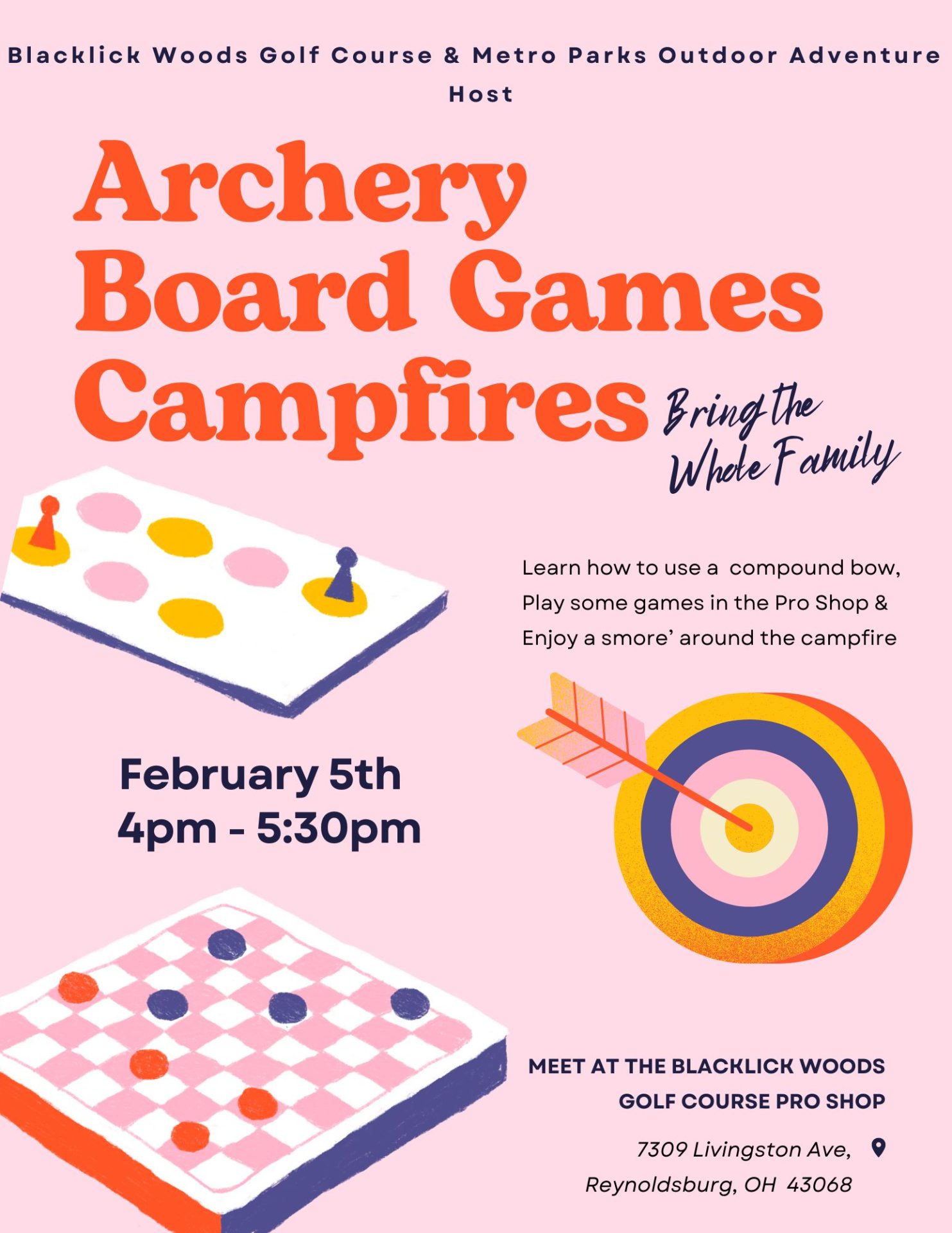 Enjoy a Try it! Archery program while getting the chance to play some board games in the Pro Shop, and enjoy a s’more around the campfire at Blacklick Woods Golf Course! Archery is for ages 8+. All other activities are open for all ages!