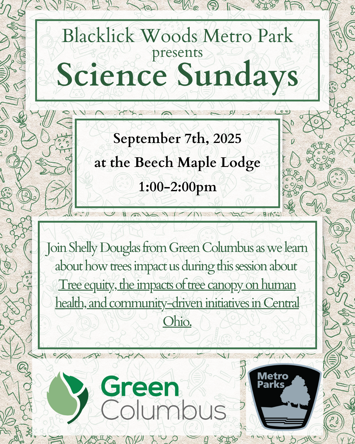 Join Shelly Douglas from Green Columbus as we learn about how trees impact us during this session about tree equity, the impacts of tree canopy on human health, and community-driven initiatives in Central Ohio. Meet at Beech Maple Lodge.