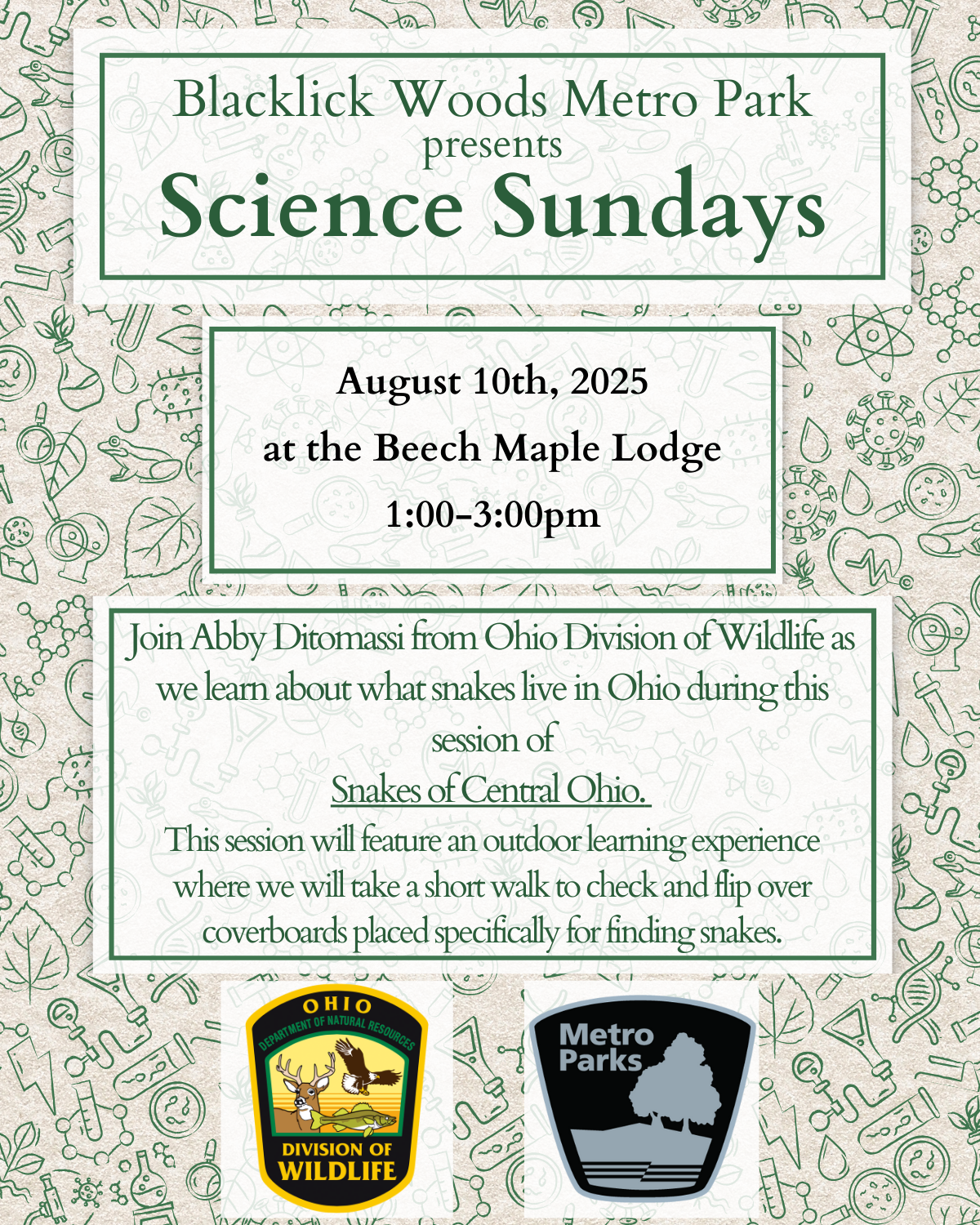 Join Abby Ditomassi from the Ohio Division of Wildlife as we learn about what snakes live in Ohio during this session of Snakes of Central Ohio. This session will feature an outdoor learning experience where we will take a short walk to check and flip over coverboards placed specifically for finding snakes. Meet at Beech Maple Lodge.