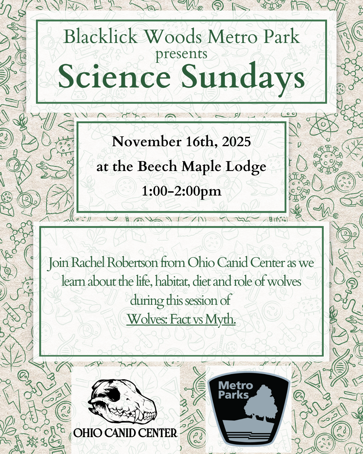 Join Rachel Robertson from Ohio Canid Center as we learn about the life, habitat, diet and role of wolves during this session of Wolves: Fact versus Myth. Meet at Beech Maple Lodge.