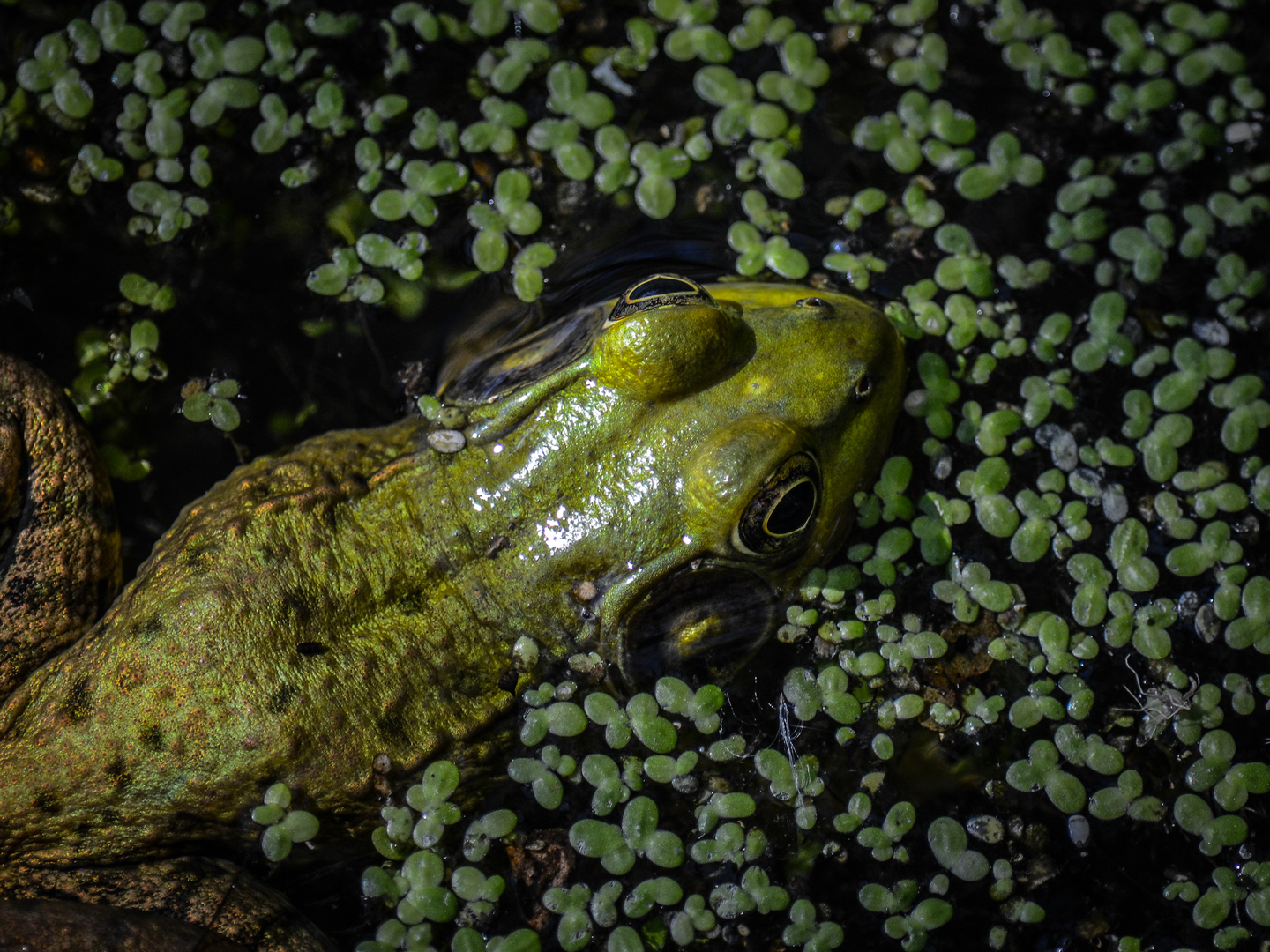 Bullfrog swims through aquatic plants at Inniswood wetland