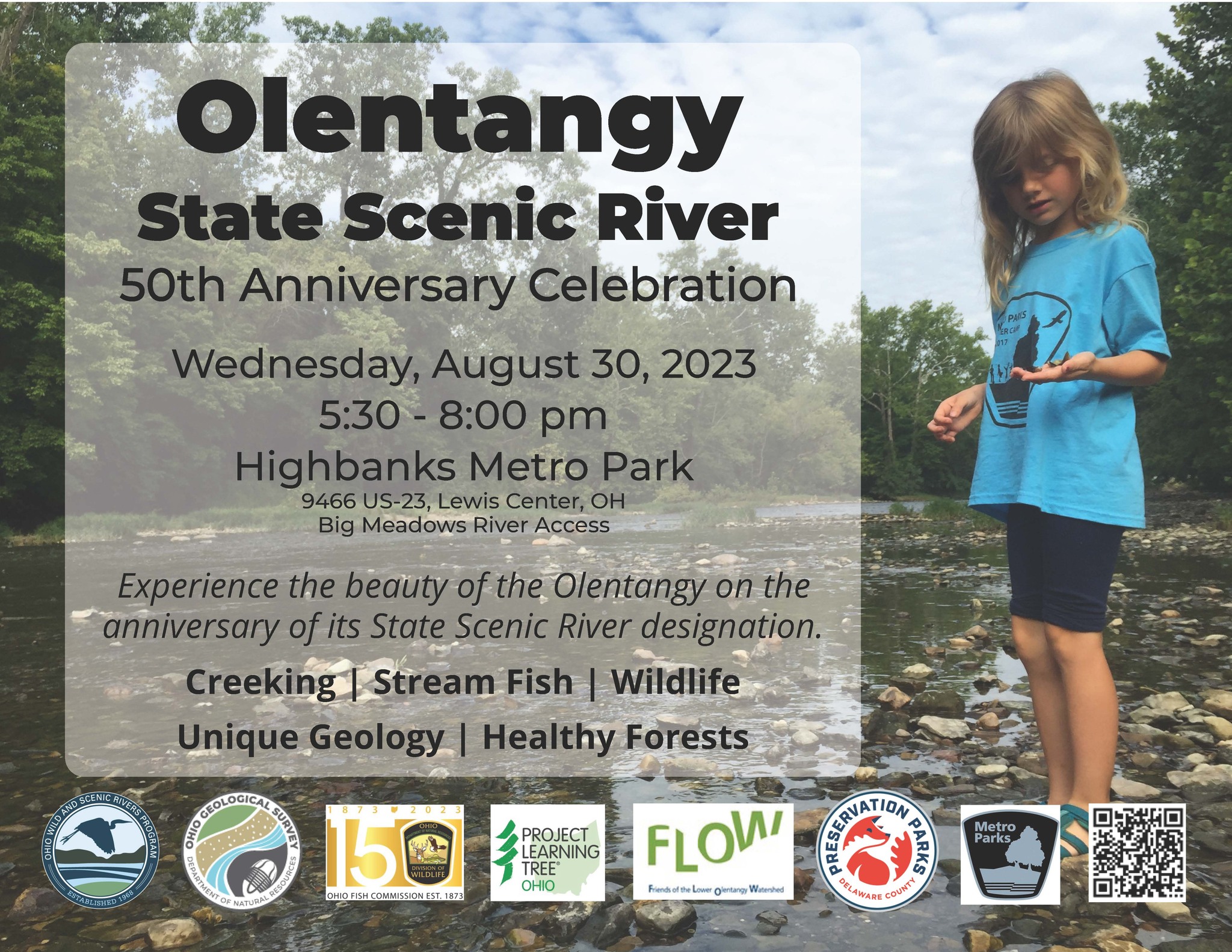 Celebrate the Olentangy River’s 50th Anniversary of Scenic designation with Ohio Division of Natural Areas & Preserves and various community partners. Learn about the unique attributes of the river and the importance of the surrounding landscape for preserving water quality. Community partners include Scenic Rivers and Preserves, OSU, Ohio Division of Forestry, Delaware Preservations Parks, Friends of the Lower Olentangy (FLOW), and Highbanks Metro Park. Fun activities for the whole family! Participants are welcome to go into the river and explore. Don’t miss seeing the fish of the Olentangy through an electroshocking demonstration (all fish are unharmed and released at the end of the program).