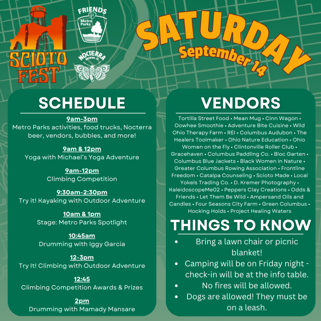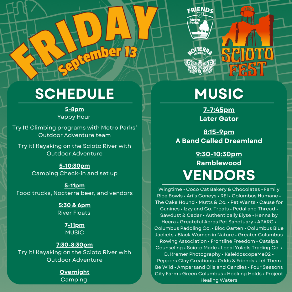Scioto Fest will be bigger and better than ever this year. All the fun begins at Scioto Audubon Metro Park at 5pm on Friday, September 13, 2024 with Yappy Hour, Try It! climbing wall programs, river floats, food trucks, Nocterra beer, plus a DJ and live bands. Find the full schedule of events here.