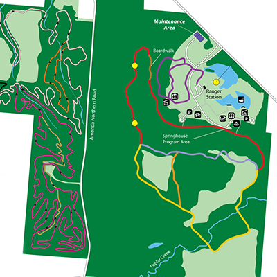 Features steep climbs and descents through deep woods. The 12- to 18-inch-wide trail has a narrow creek bridge, banked turns, and a couple of short sections of sandstone cobble. A 5-mile inner loop is the beginner/intermediate trail and the outer loop is the advanced trail.