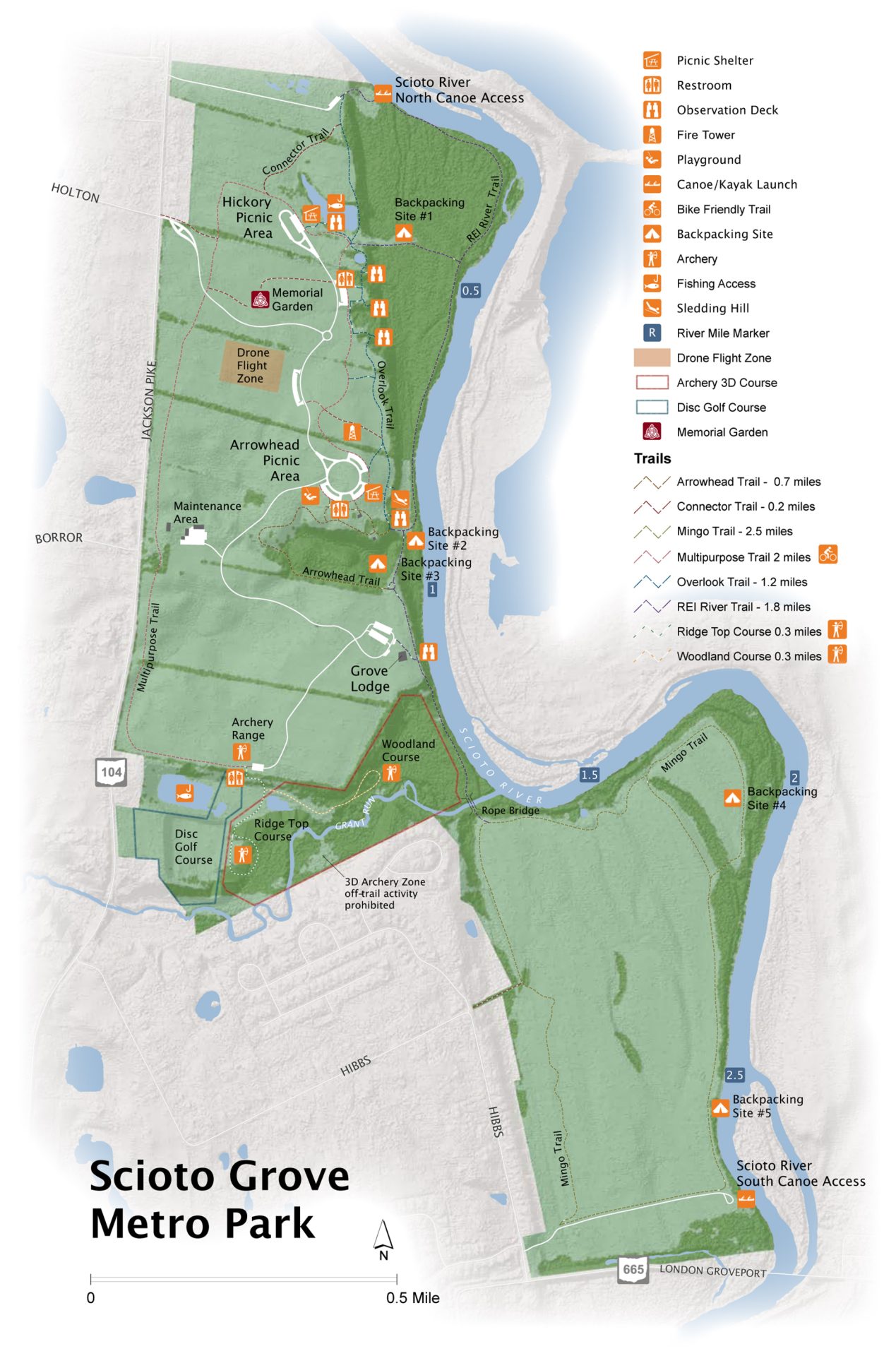 Loops around the southern section of the park and runs alongside the Scioto River.