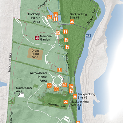 Backpacking is available along the REI River Trail for those just getting into the sport, as well as those seasoned backpackers who want a quick overnight without having to journey several hours. For additional information and to make a reservation visit SignUpGenius. Backpacking is available every weekend (Friday and Saturday nights), from the first weekend in April through the last weekend in October.
